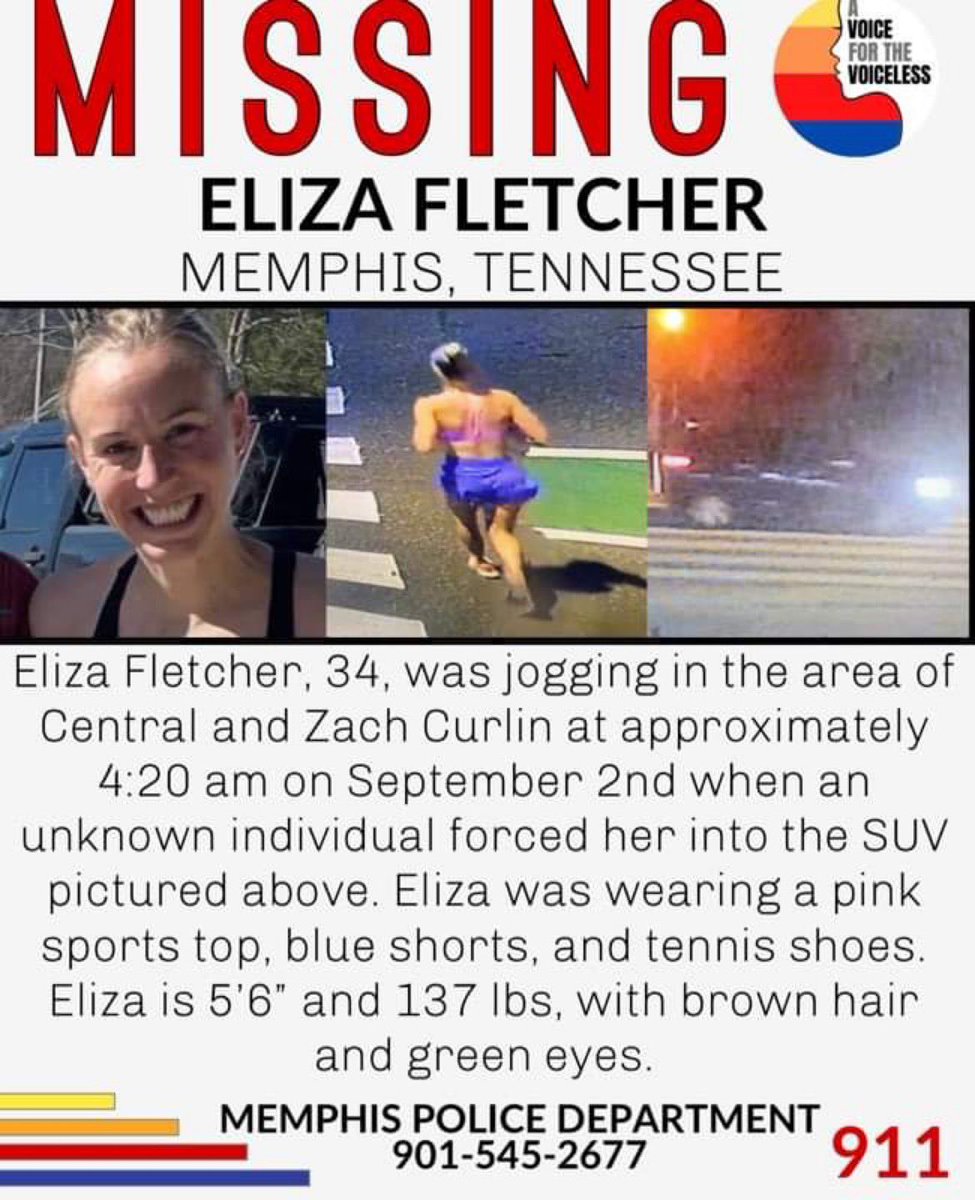 21 hours agoEliza Fletcher 34 was running on Central Avenue in Memphis at 430 am. A visitation for Eliza will be held Friday July 29. When an unknown individual approached her and forced her into an SUV in the area of.